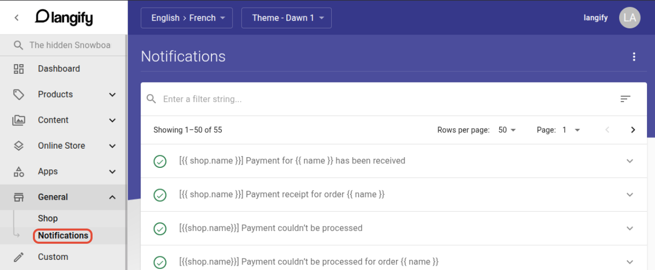 Shopify E-Mail notifications can be translated in your 'Notification' section of langify.